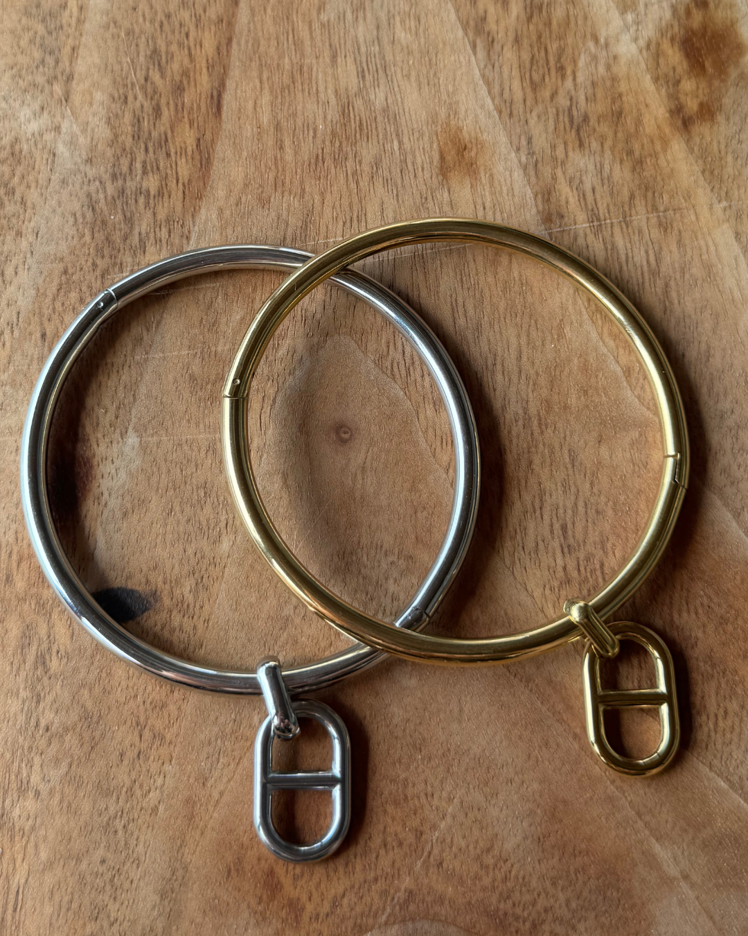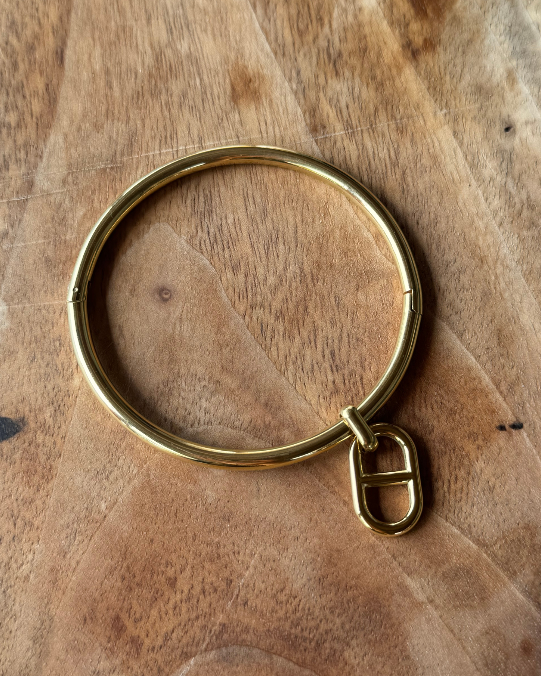 Jonc en acier inoxydable doré. Ce jonc peut s'ouvrir pour pouvoir le mettre facilement à votre poignet.