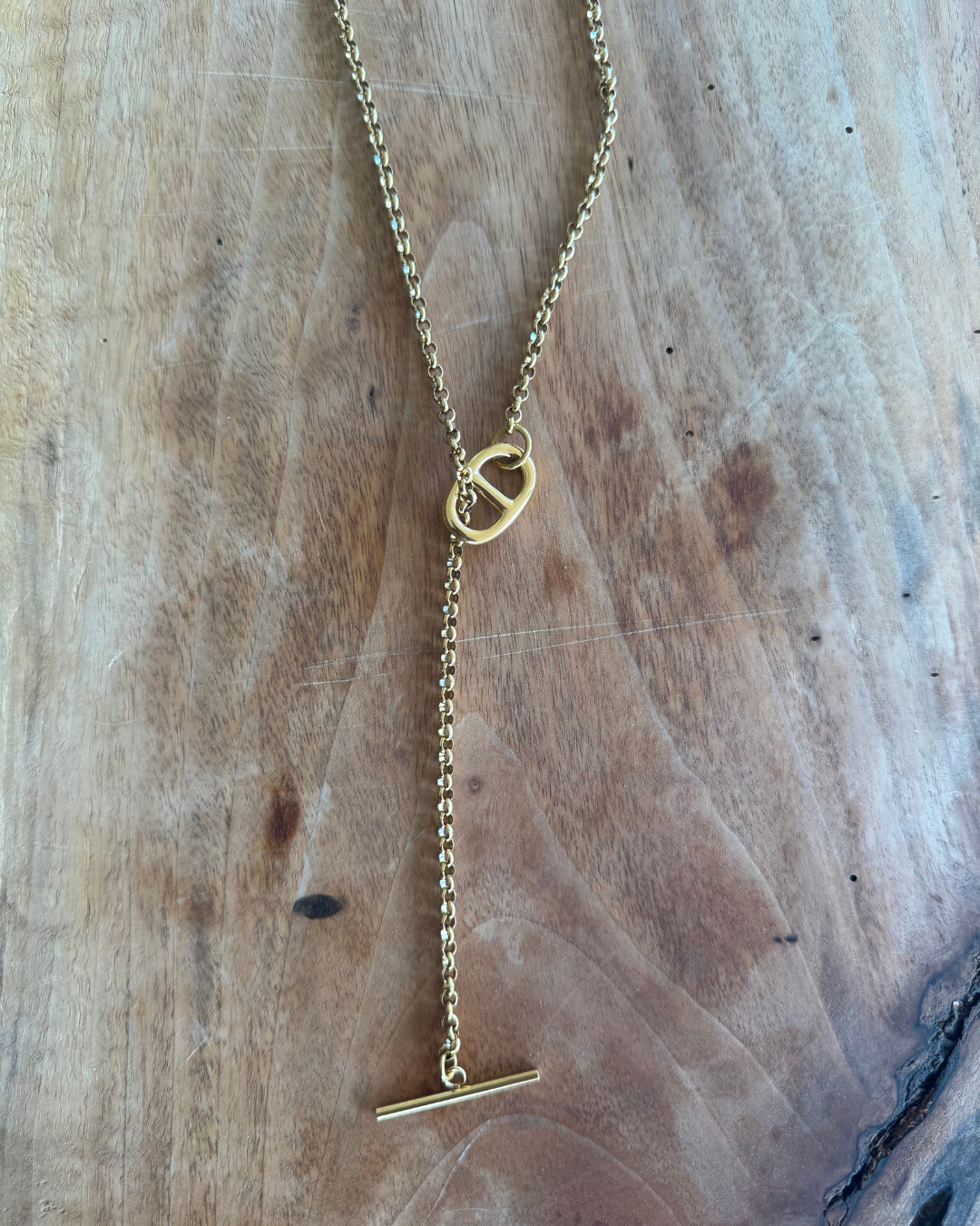 Sautoir en acier inoxydable doré.