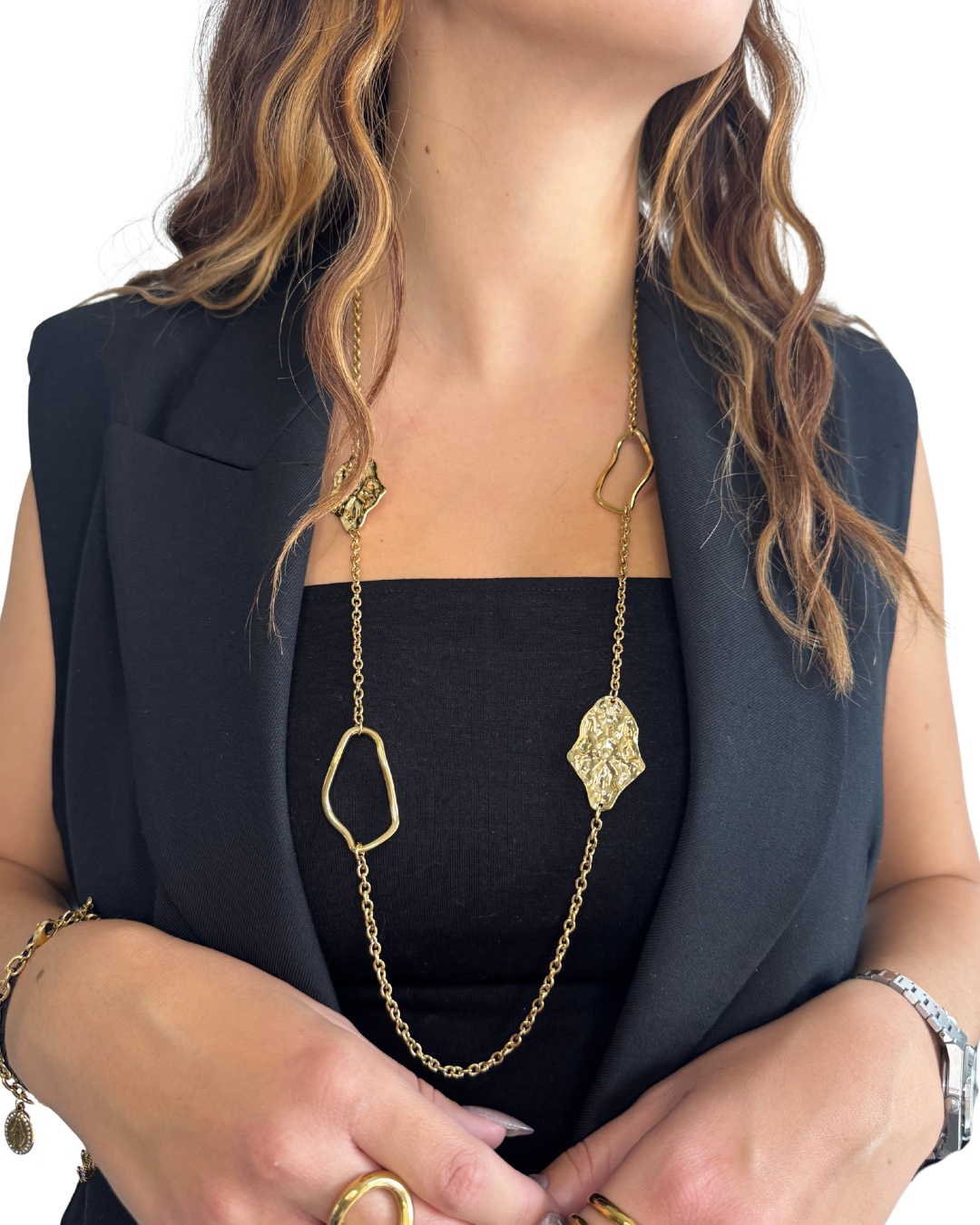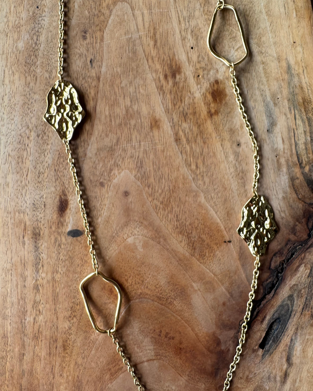 Sautoir en acier inoxydable doré.